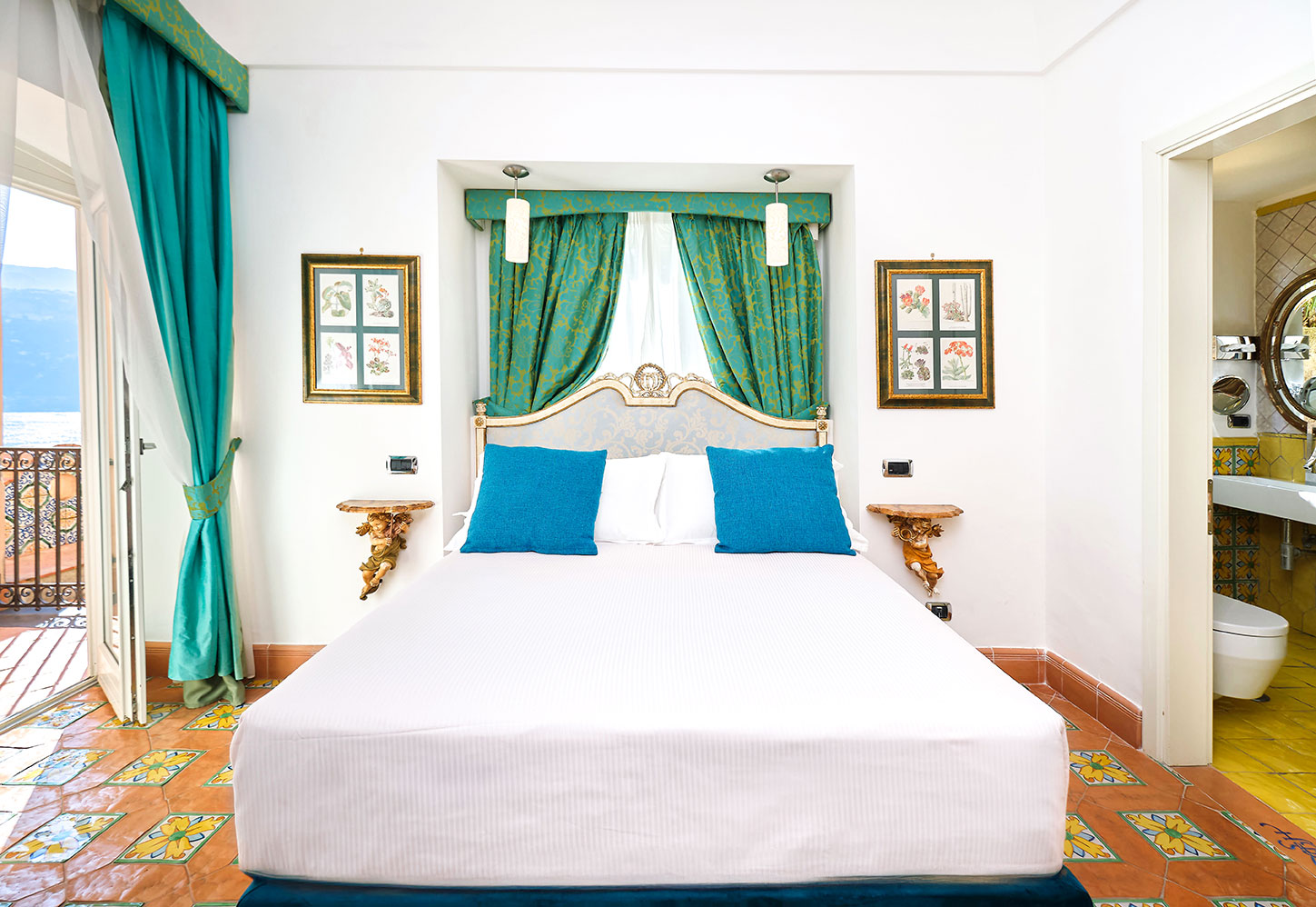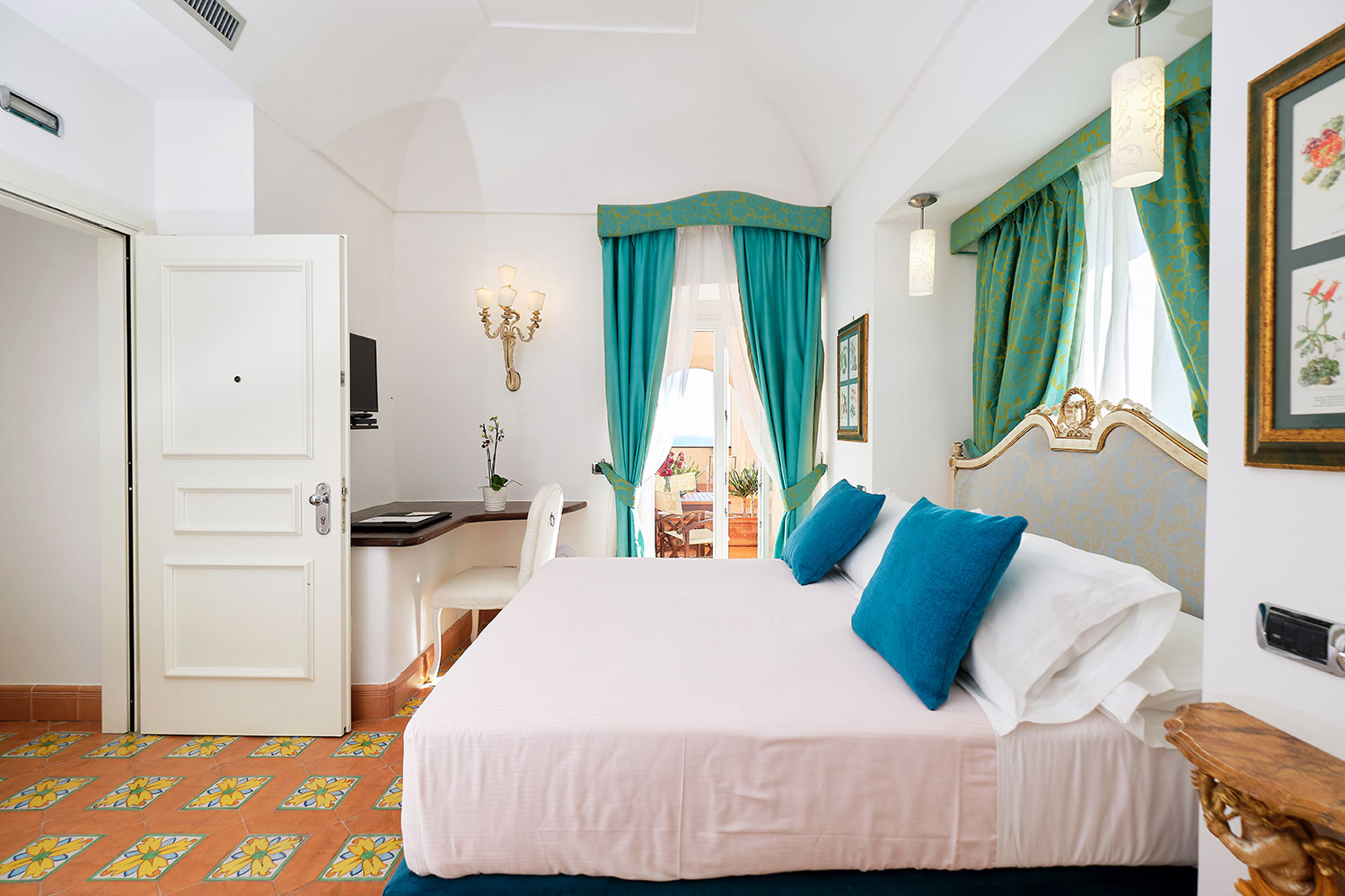 Our Standard rooms welcome our guests with elegance, furnished with classic yet Mediterranean style. Every room has a private balcony or terrace with frontal or lateral sea view. They offer Jacuzzi shower, Vietri ceramic bathrooms, terracotta floors, and a comfortable queen bed.